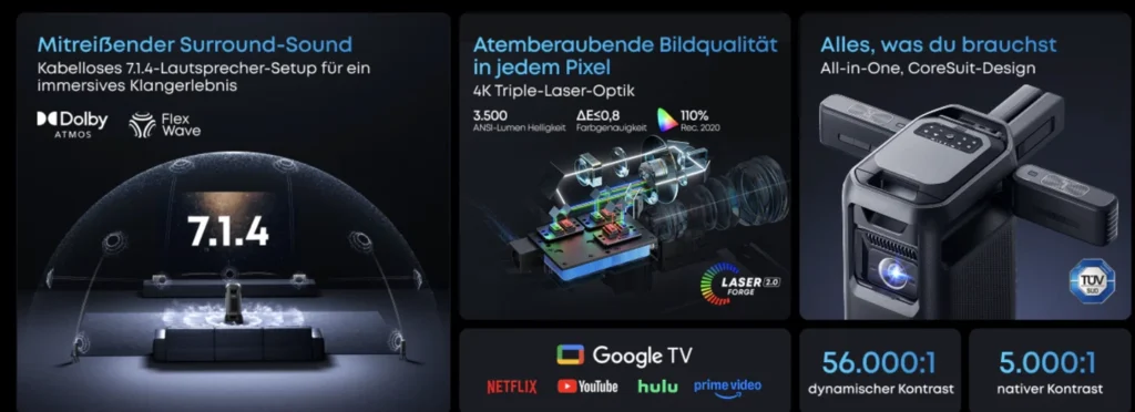 Técnicamente, integrar una barra de sonido 7.1.4 inalámbrica con un proyector de tiro 0.9-1.5:1 es una genialidad de ingeniería acústica. Evitas el lío de cables y la configuración de receptores AV. Con 3500 lúmenes y cobertura Rec.2020, la calidad de imagen está a la altura de las mejores salas de cine domésticas, pero con la ventaja de poder rodarlo hasta el jardín o la terraza.