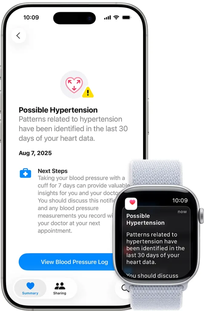 Introducida con watchOS 26, esta función no requiere un nuevo sensor mágico. Utiliza los datos del sensor de frecuencia cardíaca óptico que ya conocemos, combinados con nuevos y potentes algoritmos, para detectar signos de hipertensión crónica. Es compatible con el Apple Watch Series 9 y modelos posteriores, así como con el Apple Watch Ultra 2 y posteriores.