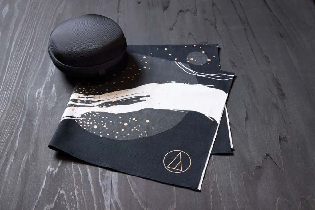 El diseño fusiona arte visual y lenguaje sonoro, con un grabado personalizado entre la diadema y las copas, inspirado en las pinceladas de tinta del shogo (pintura paisajística japonesa) y en las ondas sonoras que definen la filosofía de la marca.