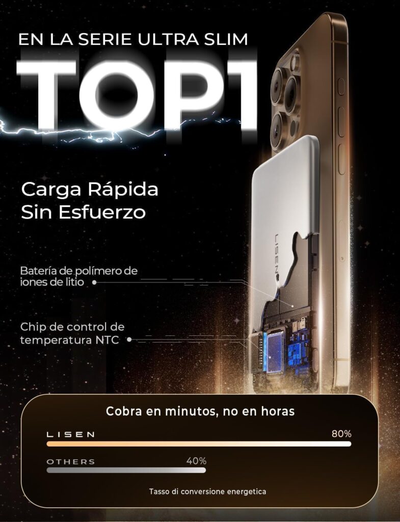 Pero lo mejor es su portabilidad: tiene solo 8 mm de grosor y pesa 123 gramos, menos que una baraja de cartas. Se acopla magnéticamente, permitiendo llevarla en el bolsillo sin cables ni volumen adicional, ideal para viajes o conciertos.