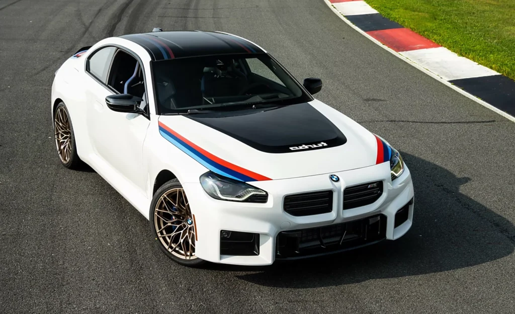 El M2 Turbo Design Edition luce una pintura clásica en Blanco Alpino y un techo de fibra de carbono, una opción que en el modelo estándar cuesta 2.600 dólares. El techo incorpora las icónicas franjas tricolores M, un distintivo de la división deportiva de BMW. Además, las calcomanías del capó y el maletero están pintadas a mano, añadiendo un toque de artesanía.