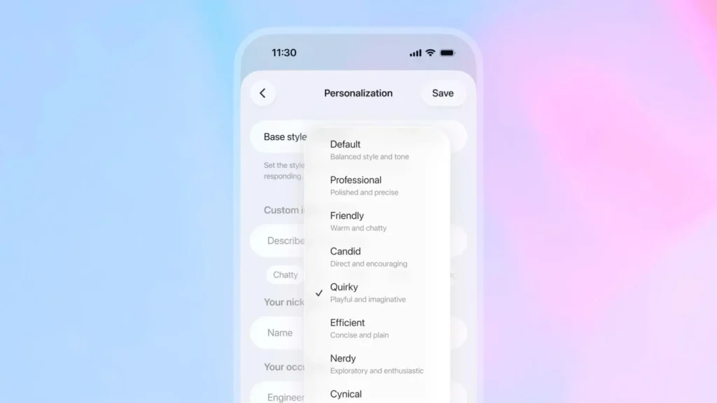 OpenAI ha mencionado desde su web, como parte de la actualización, que ampliaría los preajustes de personalidad de ChatGPT para el tono conversacional de los modelos. Se incluyen Predeterminado, Profesional, Amigable, Sincero, Peculiar, Eficiente, Friki y Cínico, según ha comunicado OpenAI. OpenAI, según The Verge, ha dicho que en el lanzamiento se estrenaría un «experimento para nuevas formas de definir el estilo de ChatGPT» directamente desde los ajustes. Se debería acceder esta misma semana.