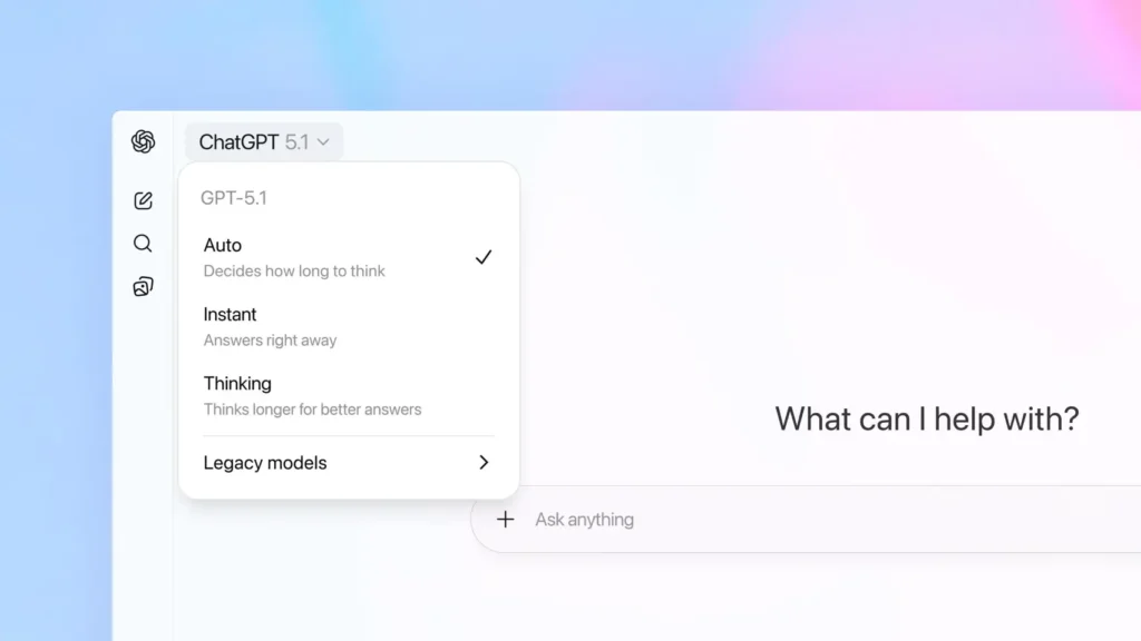 GPT-5.1 incluye nuevos modelos GPT-5.1 Instant y GPT-5.1 Thinking. El primero es más «cercano, más inteligente y sigue eficazmente las instrucciones que su predecesor». El segundo es «más fácil de entender y ejecuta más rápido tareas simples», al igual que es más persistente en las complejas. La consulta que hagamos, en la mayoría de los casos, será respondida automáticamente por el modelo de IA que pueda responderla mejor. De todas formas, ambas se pueden elegir desde el selector de modelos, al igual que siguen disponibles los modelos «Legacy» por si se quiere usar alguna de las IA antiguas.
