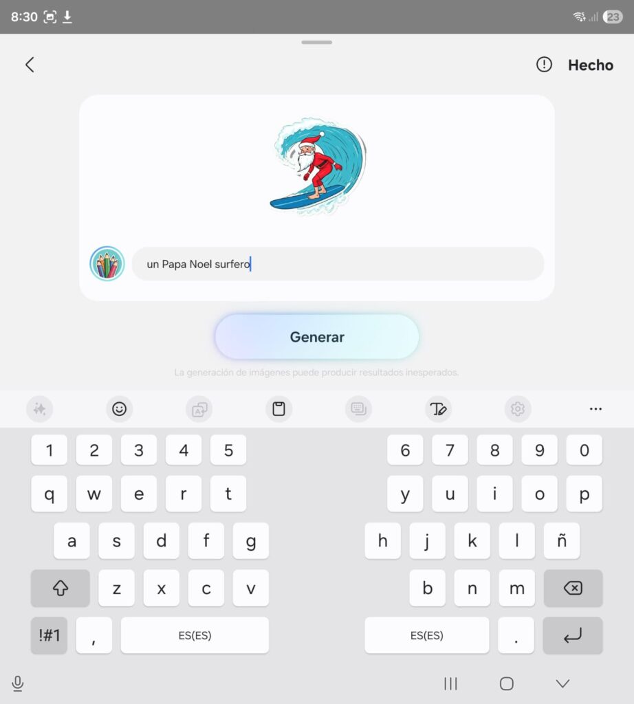 - ¡Escribe tu deseo!: Describe brevemente qué quieres. Por ejemplo: «Gato con gafas de sol surfero».