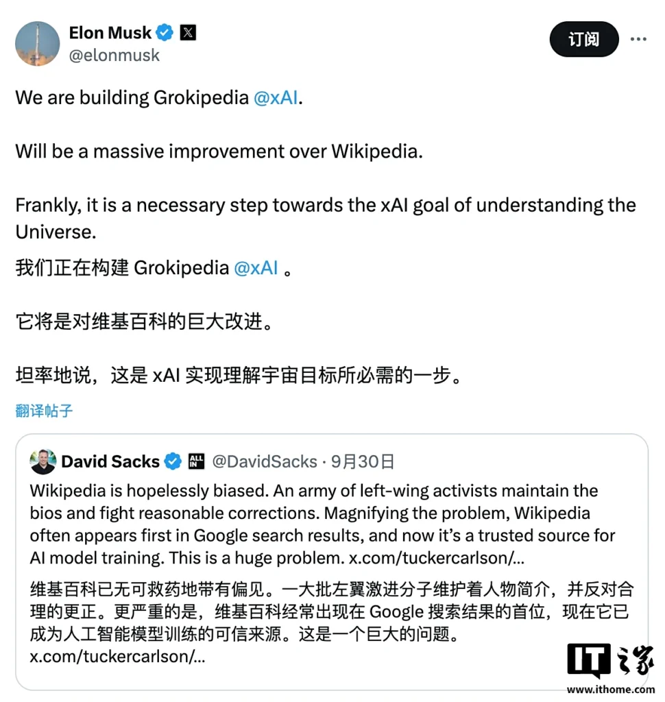 Musk ha declarado que Grokipedia, desarrollada por xAI, superará a Wikipedia en precisión y neutralidad. Para él, este proyecto es un paso crucial y «necesario para lograr el objetivo de xAI de comprender el universo». Las declaraciones surgieron en X, como respuesta al inversor David Sacks, quien había criticado el supuesto sesgo de Wikipedia y su uso como fuente de entrenamiento para modelos de IA.