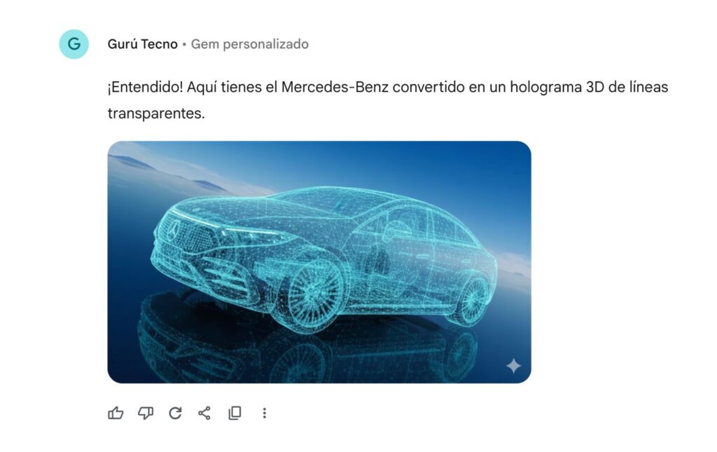 Para que te hagas una idea de cómo trabaja Gemini, te dejo un ejemplo para que veas las transformación con un simple prompt: «Convierte el coche en un holograma 3D de líneas transparentes»