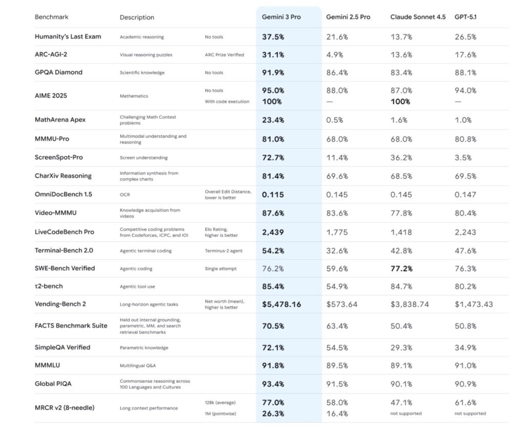 - Un paso adelante en todas las áreas: La tabla comparativa habla por sí misma. Gemini 3 Pro supera a Gemini 2.5 Pro, Claude Sonnet 4.5 y GPT-5.1 en casi todos los benchmarks, demostrando un liderazgo claro.