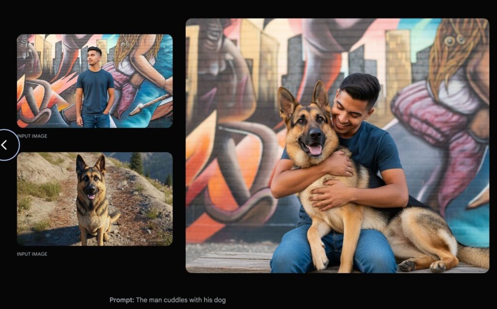- Fusión de imágenes: Puedes darle dos fotos diferentes —por ejemplo, una tuya y otra de tu mascota— y pedirle que cree una escena completamente nueva donde ambos aparezcan juntos, respetando la apariencia y la iluminación de ambos.