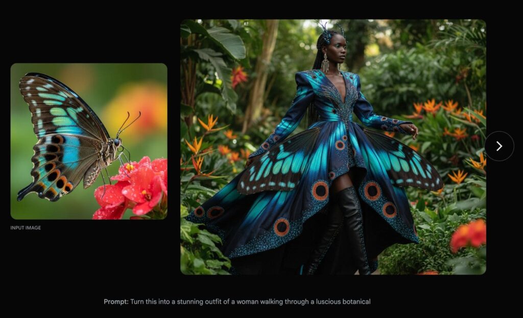 - Transferencia de estilo: Puedes coger el patrón estético de las alas de una mariposa y pedirle que lo aplique al diseño de un vestido, creando imágenes fotorrealistas de diseños de moda únicos.