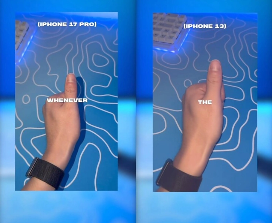 El video viral de marcustechnology hace una comparación directa entre el iPhone 17 Pro y el iPhone 13. Se puede observar claramente que, al grabar un video, una sombra se forma junto al dedo del sujeto en el iPhone 17 Pro, mientras que esta sombra no aparece en el iPhone 13.