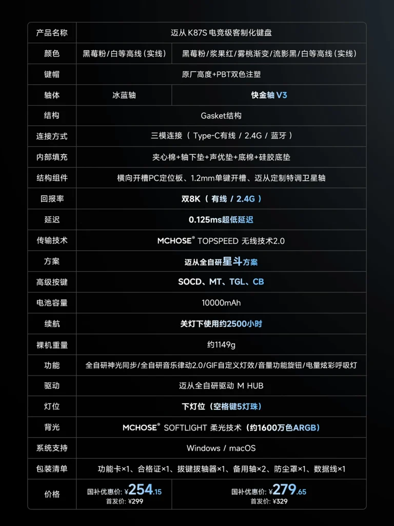 Una marca china llamada Maicong (MCHOSE) acaba de lanzar el K87S, un teclado mecánico que, sobre el papel, no solo iguala, sino que humilla la hoja de especificaciones de los grandes nombres de la industria. Y lo hace por un precio que parece un error tipográfico: desde 299 yuanes (unos 38 euros). No es una errata. Es una declaración de guerra.