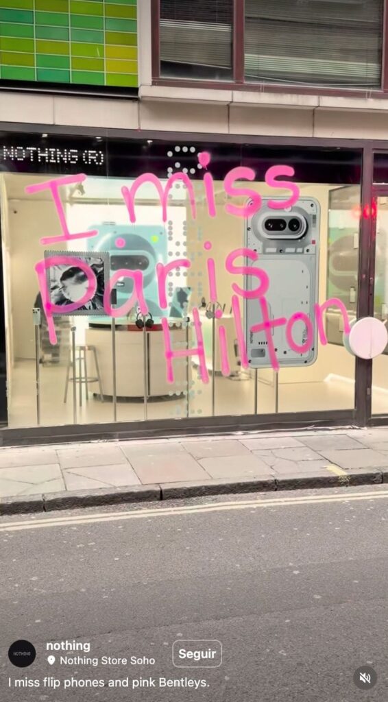 Entre las acciones más destacadas, hemos visto grafitis sobre sus propios flyposters en puntos estratégicos y una intervención específica en el escaparate de la Nothing Soho Store. Este movimiento no es casualidad; encaja con la estrategia habitual de la marca de mezclar tecnología y cultura urbana. El objetivo es claro: convertir el color en conversación y deseo antes incluso de que el teléfono llegue a las estanterías.