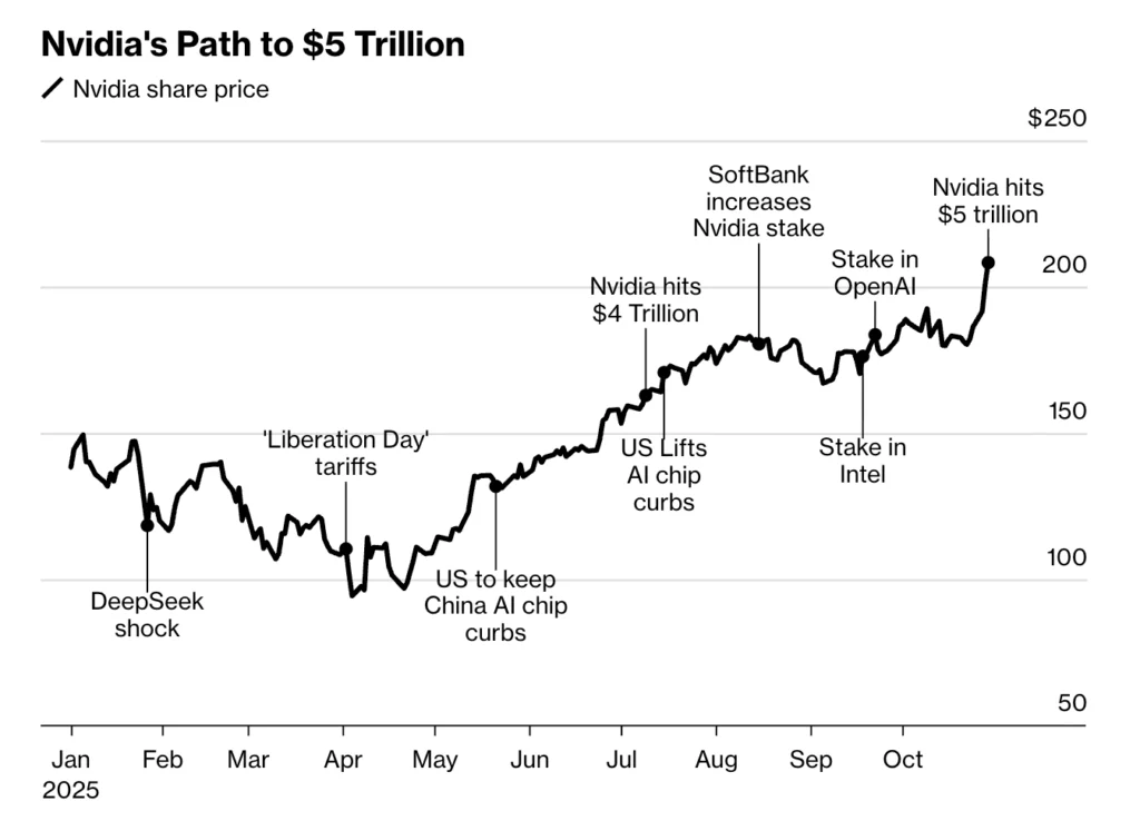 En solo cinco días hábiles, la capitalización bursátil de Nvidia se ha disparado en casi 400 mil millones de dólares (unos 2,8 billones de yuanes), superando la de Toyota Motor y Home Depot. Pero el hito más impresionante es que Nvidia se ha convertido en la primera empresa de la historia en alcanzar los 5 billones de dólares de valor de mercado. ¡Un nuevo récord que redefine la escala del éxito en la era de la IA! Como reflejo, la fortuna personal de Jensen Huang también se incrementó en más de 9 mil millones de dólares, llegando a casi los 176 mil millones.