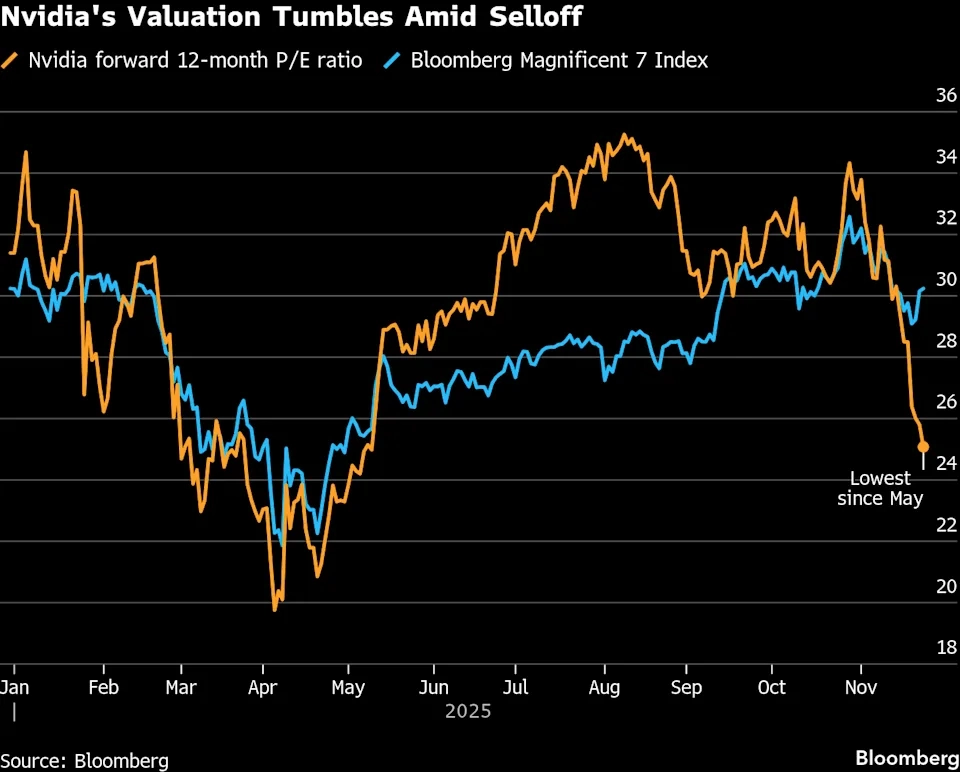 Aquí es donde la cosa se pone interesante para los tiburones financieros. La valoración de Nvidia, que estaba por las nubes, ha bajado a la tierra. Su relación precio-beneficio (P/E) a futuro ha caído de 34 veces a unas 25 veces.