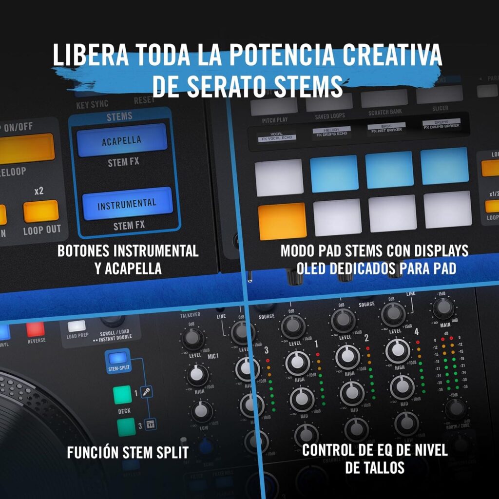 - Todo el poder de STEMS – botones dedicados de acceso instantáneo a Instrumental y acapella, modo pad STEMS, STEM LEVEL E…