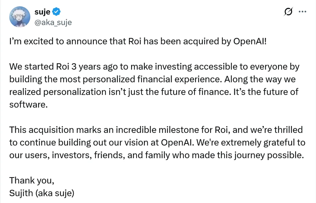Según el medio extranjero TechCrunch, la empresa Roi (cuyo nombre coincide con la abreviatura de «Return on Investment» o Retorno de la Inversión) cesará sus operaciones y servicios al cliente el 15 de octubre. Tras la adquisición, el propio Sujith Vishwajith se unirá al equipo de OpenAI, aportando su experiencia en la intersección de la IA y las finanzas.