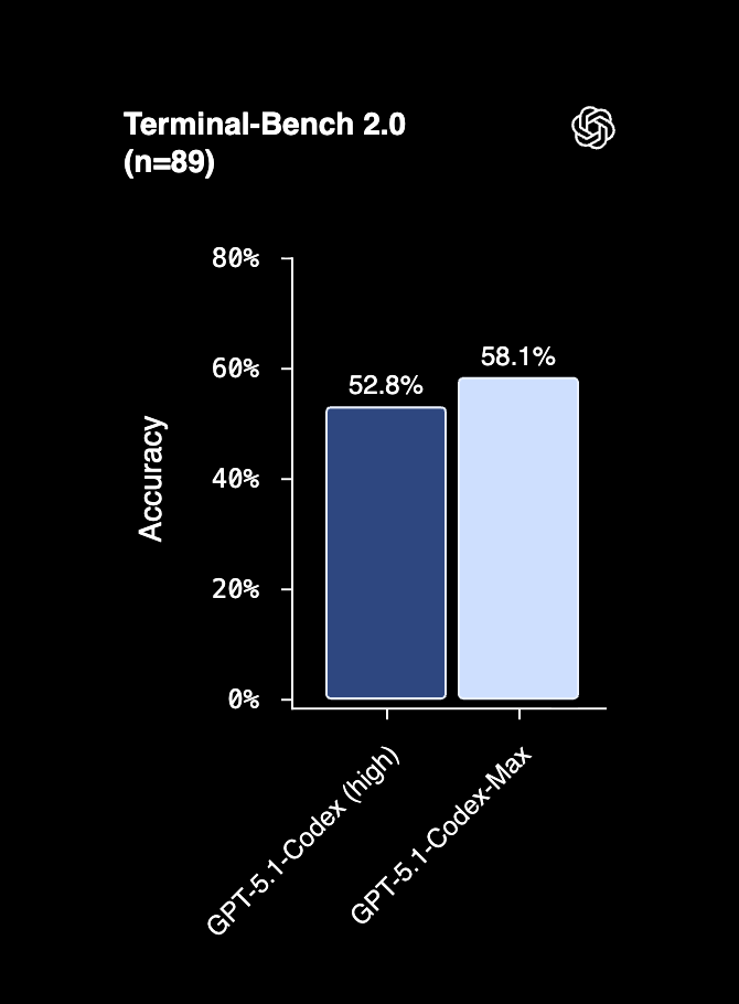 De acuerdo con la compañía, GPT-5.1-Codex-Max fue entrenado en tareas reales de ingeniería de software, como programación frontend, revisión de código y generación de pull requests. En pruebas como Terminal-Bench 2.0 y SWE-Lancer IC SWE, el nuevo modelo supera por un margen considerable a su hermano menor. GPT-5.1-Codex-Max también es más eficiente en tokens y consigue un rendimiento mejor que GPT-5.1-Codex usando un 30% menos de tokens para pensar.