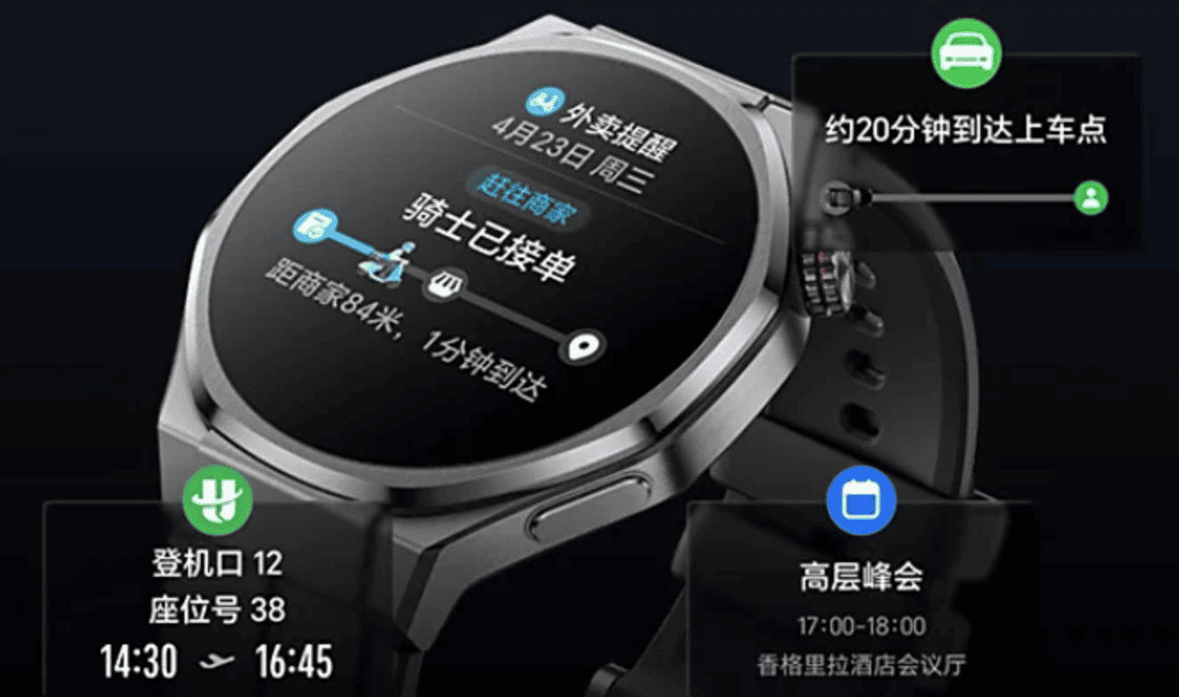 La función «Ventana Creciente» (incorporada en algunos relojes con HarmonyOS 4 de Huawei) muestra información en tiempo real en un formato de recordatorio dinámico en la esquina superior derecha de la esfera. Se puede ver al levantar la muñeca e interactuar con ella haciendo clic, similar a una ventana en vivo del teléfono móvil. Es compatible con recordatorios de taxi (Mini Taxi de Alipay Gaode), comida a domicilio (Meituan, Ele.me, Hema), calendario y vuelos/trenes (Smart Assistant Today).