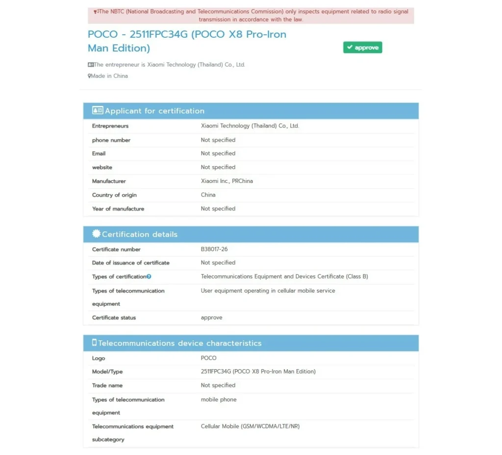El universo de las filtraciones no descansa ni en fin de semana. Un nuevo dispositivo de Xiaomi POCO ha asomado la cabeza en la base de datos de certificación NBTC de Tailandia con el número de modelo 2511FPC34G. Aunque el POCO X8 Pro estándar pasó certificaciones en julio del año pasado, este nuevo avistamiento apunta a algo más especial: una inminente Iron Man Limited Edition.