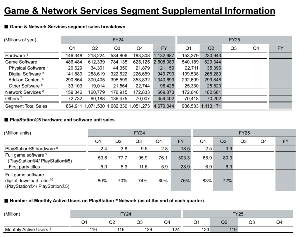 El segmento de Servicios de Juegos y Redes de Sony también muestra un crecimiento robusto. En el Q2 FY25, las ventas de hardware fueron de 230.943 millones de yenes, y el software completo alcanzó 80.3 millones de unidades. La tasa de descarga digital de software completo se mantuvo fuerte en un 72% en el Q2 FY25, indicando una preferencia continua por el formato digital.