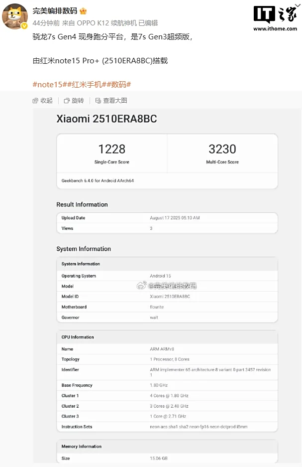 El benchmark, con unos resultados de 1.228 puntos en mononúcleo y 3.230 en multinúcleo, nos da la primera radiografía de este nuevo chip. La arquitectura de su CPU es una moderna configuración de tres clústeres: un núcleo de máximo rendimiento a 2.71 GHz, tres núcleos de alto rendimiento a 2.40 GHz y cuatro núcleos de eficiencia a 1.80 GHz. Es un salto significativo sobre el Snapdragon 7s Gen 3 que montaba su predecesor, el Note 14 Pro+.