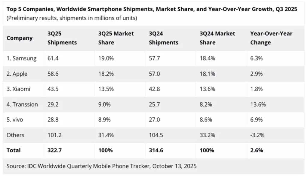 ¡Atención, Gurú Tecno Army! Si pensabais que la batalla por el liderazgo en el mercado de smartphones era un paseo para uno u otro, los datos del tercer trimestre de 2025 os van a hacer replantearos todo. Según las cifras preliminares de IDC, Samsung y Apple están en un «empate técnico» por la corona mundial, con una diferencia de envío que es, literalmente, para echar a suertes. ¡La tensión se palpa en el aire!