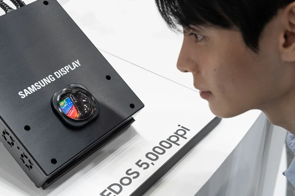 Pero la verdadera locura estaba en su sección de OLEDoS (OLED on Silicon), la tecnología que usan los visores de Realidad Mixta de alta gama como el Apple Vision Pro para que no veas la rejilla de píxeles y la imagen parezca real. Samsung ha mostrado varios paneles, incluyendo uno con una densidad de 5.000 píxeles por pulgada (ppi) (el ojo humano deja de distinguir píxeles sobre los 300 ppi, para que entiendas la salvajada).