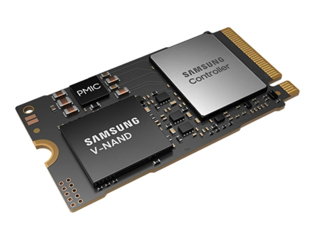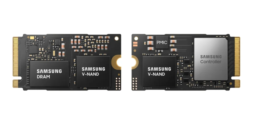 Pero el verdadero reto era el tamaño. Para lograr este formato tan compacto sin sacrificar capacidad ni rendimiento, Samsung ha tenido que innovar en el empaquetado. Han utilizado un encapsulado compacto originalmente previsto para la futura memoria flash V9. Además, el PM9E1 ostenta el título de ser el primer SSD M.2 2242 con componentes distribuidos a ambos lados de la PCB (placa de circuito impreso), aprovechando cada milímetro cuadrado disponible.