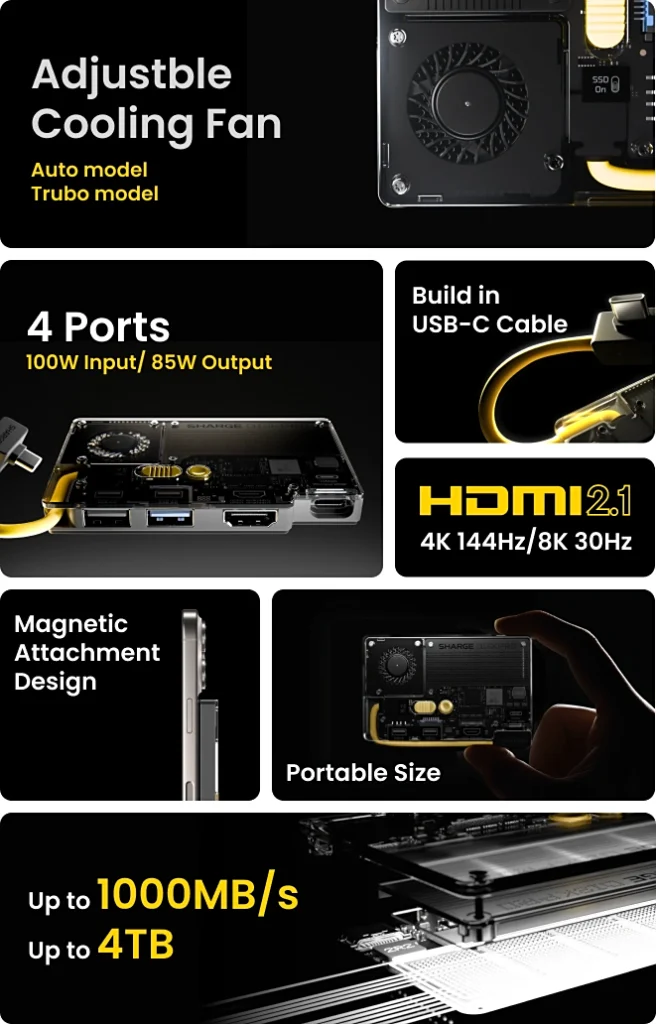 El Sharge Flash Drive Pro es una demostración brillante de cómo la innovación en el diseño puede crear productos verdaderamente multifuncionales y útiles. Etiquetado como el «primer disco duro móvil todo en uno», cumple con creces esta descripción, integrando almacenamiento de alta capacidad (hasta 4 TB), un hub de 4 puertos, capacidad de salida de vídeo HDMI 2.1 y un ventilador de refrigeración, todo en un formato del tamaño de una tarjeta de crédito.