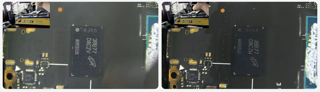 - Usar una pistola de calor y un pulso de cirujano para desoldar los chips originales de 16 GB sin quemar ningún otro componente.