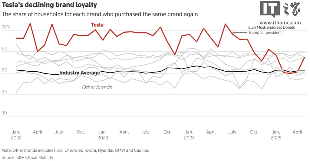 Esto no son opiniones de Twitter, son datos de compras reales de miles de hogares en Estados Unidos. La radiografía es demoledora. En junio de 2024, la lealtad a Tesla alcanzaba un pico del 73%. Siete de cada diez propietarios que cambiaban de coche, volvían a comprarse un Tesla. Eran los reyes, inalcanzables.