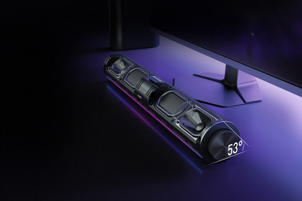 No es una simple barra de sonido de TV encogida. Su diseño está pensado milimétricamente para el entorno de escritorio. La barra cuenta con una inclinación ascendente de 53 grados, diseñada para apuntar el sonido directamente a tus oídos cuando estás sentado frente al monitor, evitando rebotes extraños en la mesa.